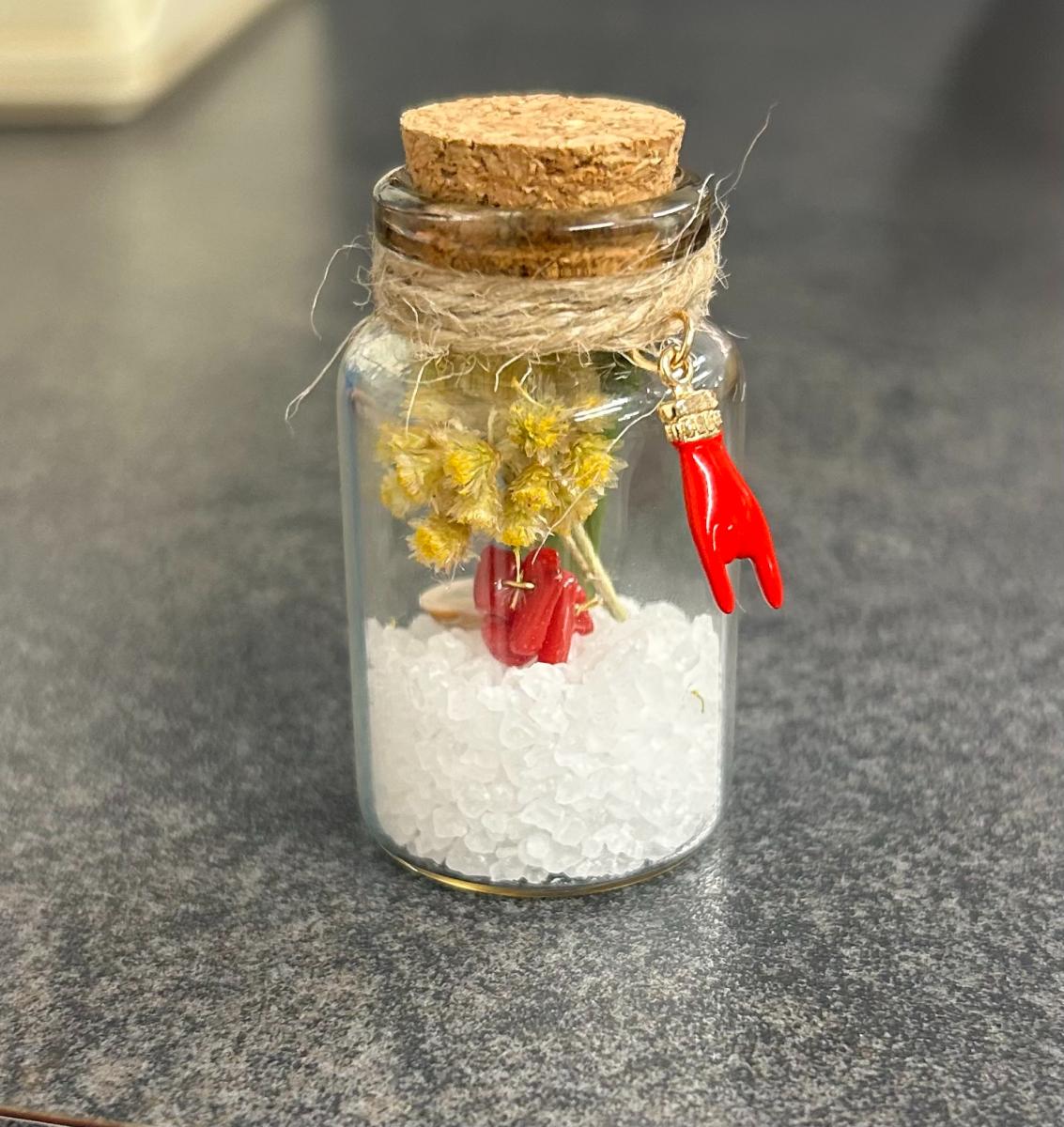 Ce charmant flacon en verre renferme un concentré de symboles traditionnels de protection et de chance, soigneusement sélectionnés pour leurs vertus spirituelles et enracinés dans la culture méditerranéenne :